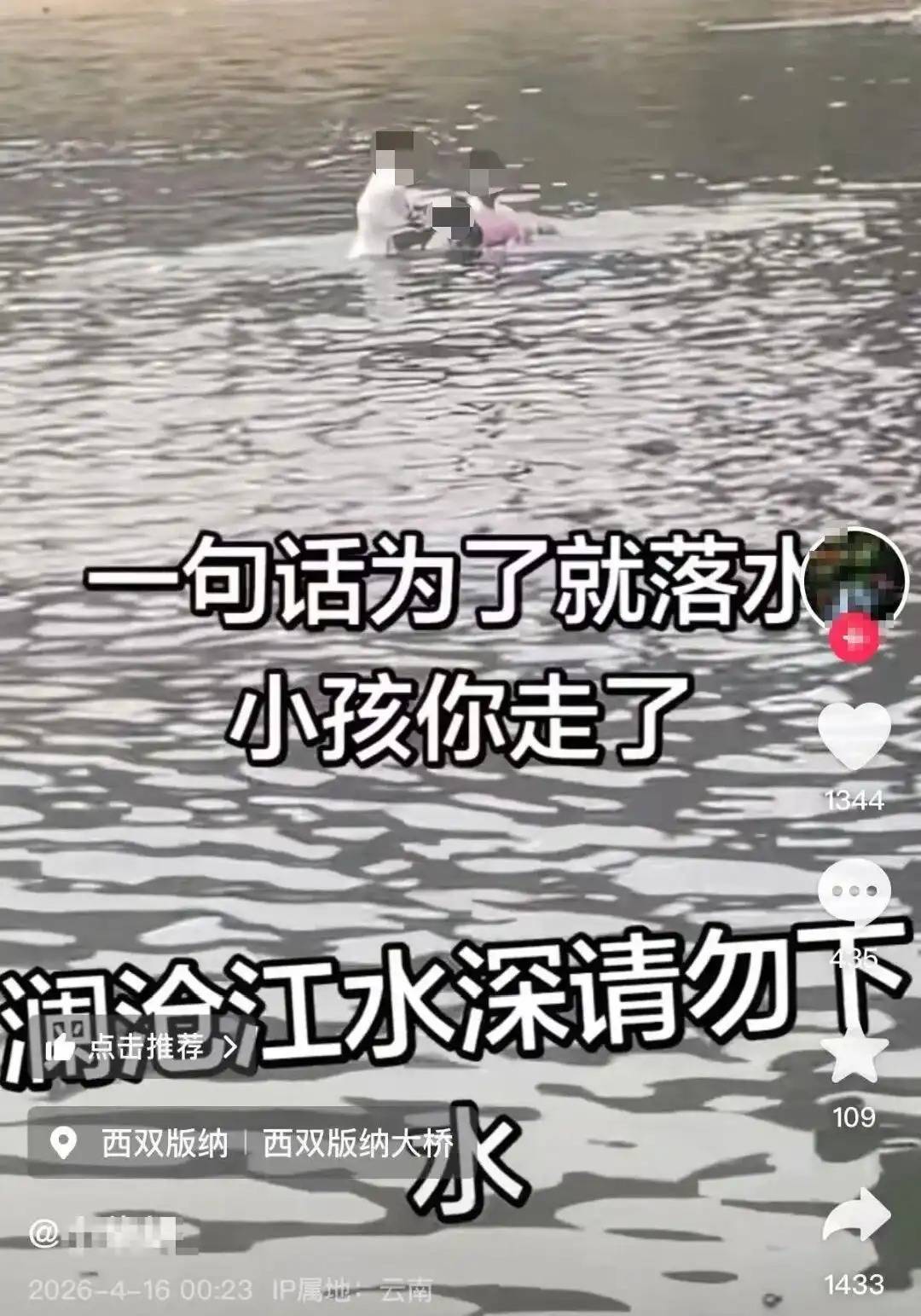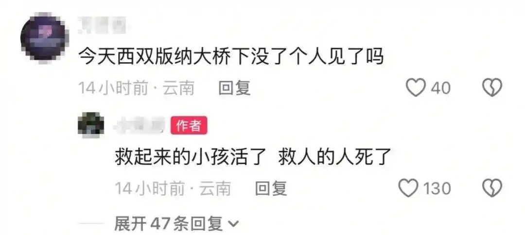据相关视频,两白衣男子在水中救一名女童,附近岸上有多人。视频评论区,有人评论,“今天西双版纳大桥下没了个人见了吗”,作者回复“救起来的小孩活了,救人的人死了”。视频发布时间是4月16日凌晨,定位在景洪市西双版纳大桥。